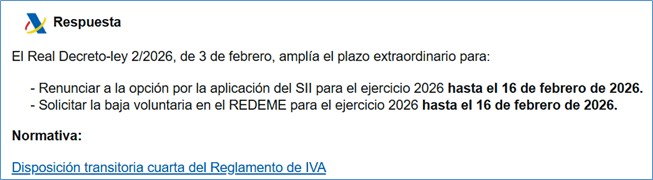 Ampliación Nota sobre los efectos, en el ámbito tributario, del Real Decreto-ley 16/2025, de 23 de diciembre, y del Real Decreto-ley 2/2026, de 3 de febrero, en relación con la renuncia al SII y la baja en REDEME